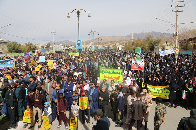 در این راهپیمایی که شعارهای ضد استکباری "مرگ بر آمریکا"، «مرگ بر اسرائیل»، «هیهات منا الذله»، «ما همچنان ایستادهایم»، «ما میتوانیم»، «ذلت نمیپذیریم»، «استقلال آزادی جمهوری اسلامی» توسط دانش آموزان و دانشجویان و همه اقشار مختلف شرکت کننده در مراسم سر داده می شد با آرمان های امام راحل و نظام مقدس جمهوری اسلامی تجدید بیعت کردند.