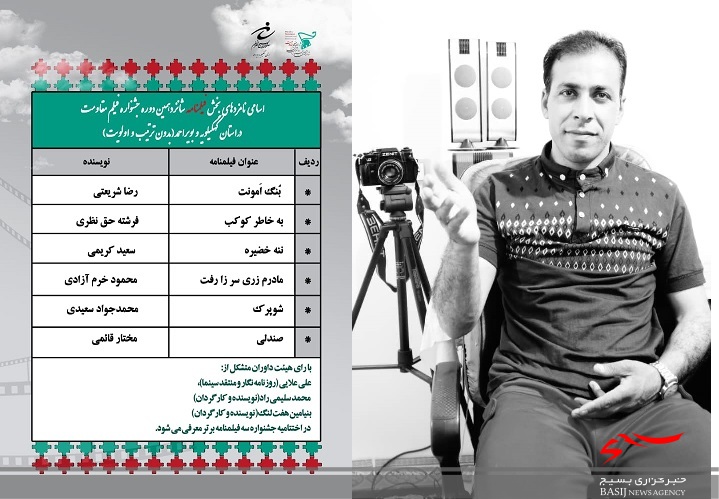 وی بیان کرد: هیئت داوران شانزدهمین دوره جشنواره فیلم مقاومت در استان کهگیلویه و بویراحمد در بخش فیلمنامه  " بُنگ امونت" به نویسندگی رضا شریعتی،" به خاطر کوکب" به نویسندگی فرشته حق نظری، " ننه خضیره " به نویسندگی سعید کریمی, " مادرم زری سر زا رفت"  به نویسندگی محمود خرم آزادی، " شوپرک " به نویسندگی محمد جواد سعیدی و " صندلی"  به نویسندگی مختار قائمی را  به عنوان نامزد این بخش انتخاب کرده اند.
