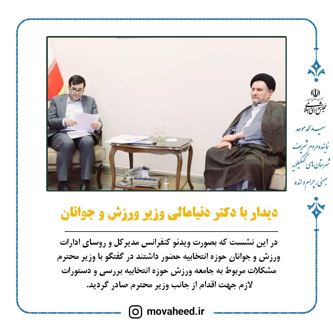نماینده مردم شهرستان های کهگیلویه، بهمئی، چرام و لنده با دکتر دنیا مالی وزیر ورزش و جوانان دیدار و گفتکو کرد.