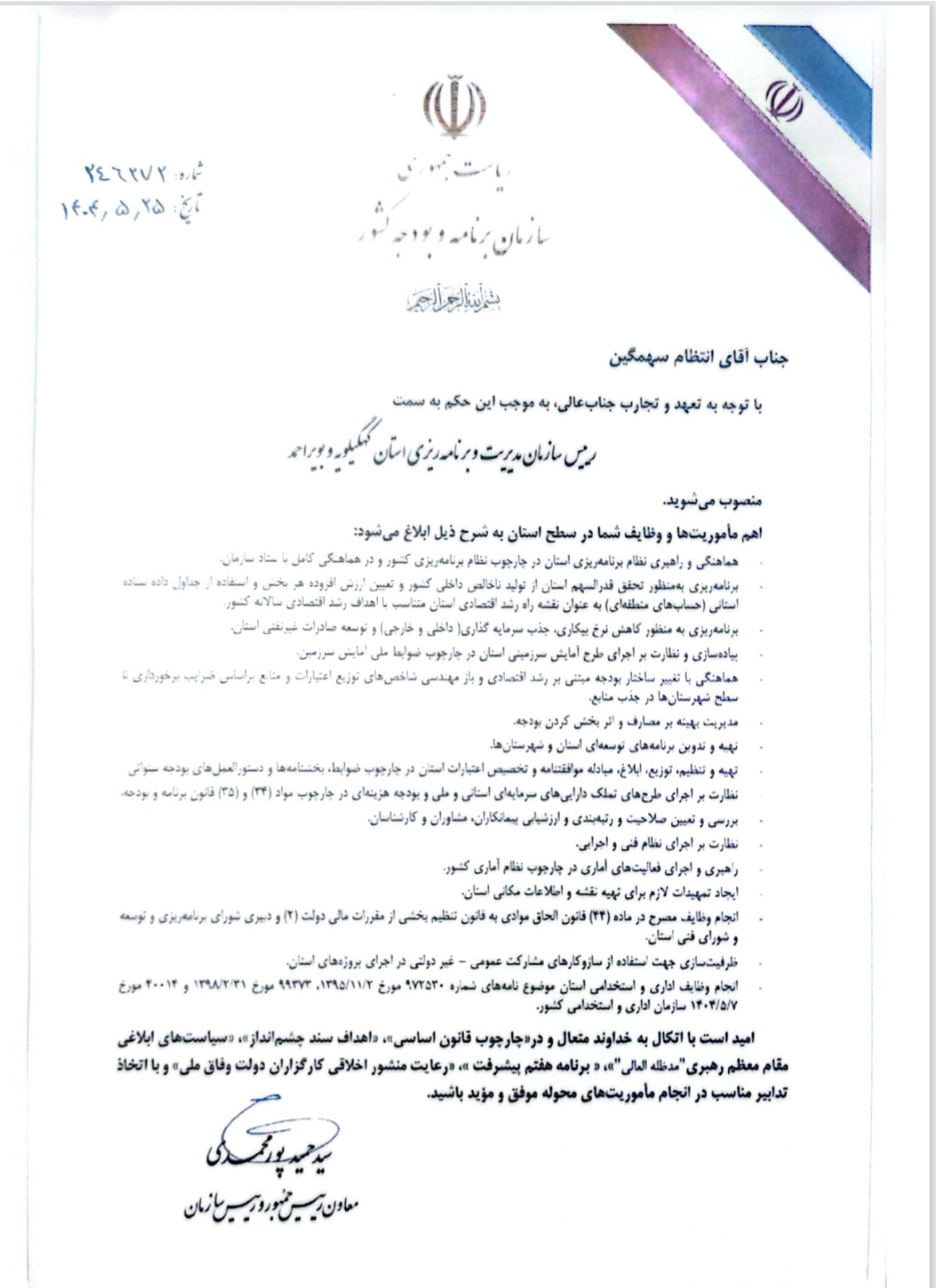 طی حکمی از سوی معاون رئيس‌جمهور و رئيس سازمان برنامه و بودجه كشور،رئیس سازمان مدیریت و برنامه‌ریزی استان کهگیلویه و بویراحمد منصوب شد.