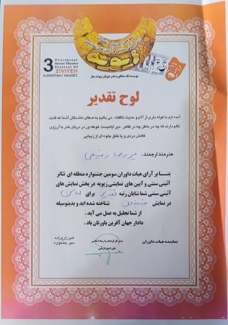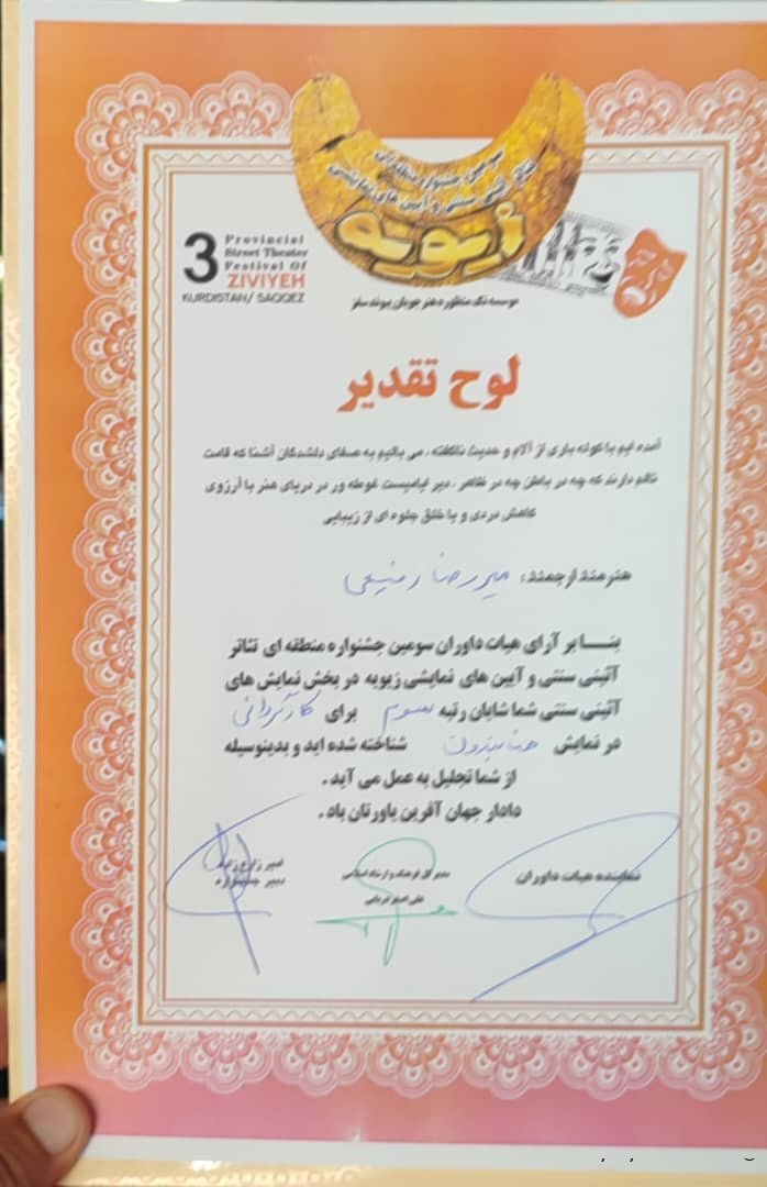 *جایزه سوم کارگردانی: به میررضا رفیعی برای طراحی و هدایت این اثر نمایشی اهدا شد.*
