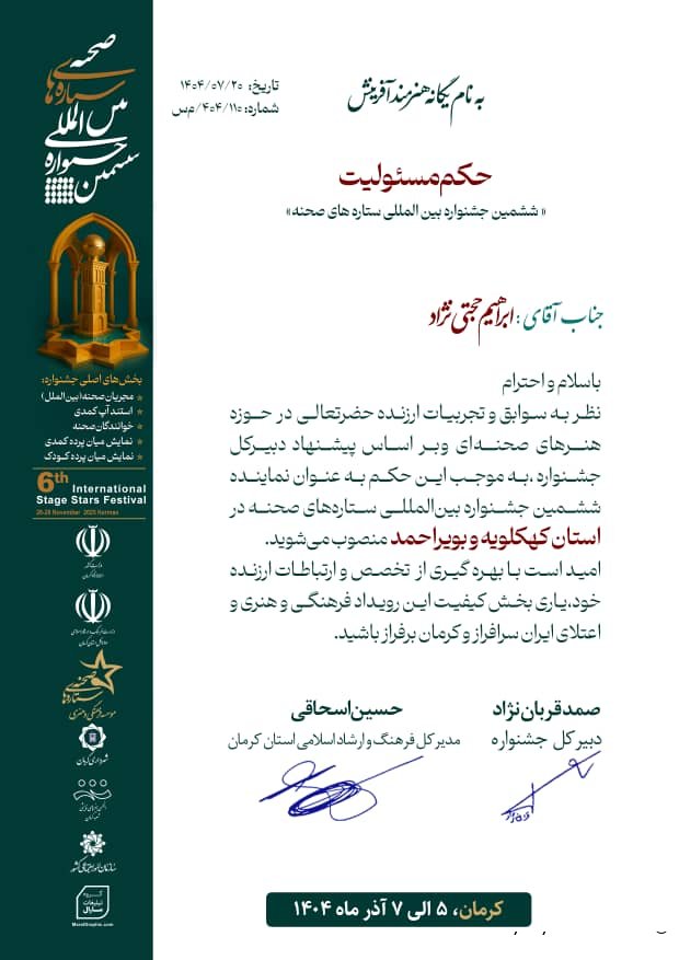 همچنین به پیشنهاد دبیرکل جشنواره، ابراهیم حجتی‌نژاد، هنرمند و فعال فرهنگی استان کهگیلویه و بویراحمد، به عنوان نماینده رسمی ششمین جشنواره بین‌المللی ستاره‌های صحنه در این استان منصوب شده است.