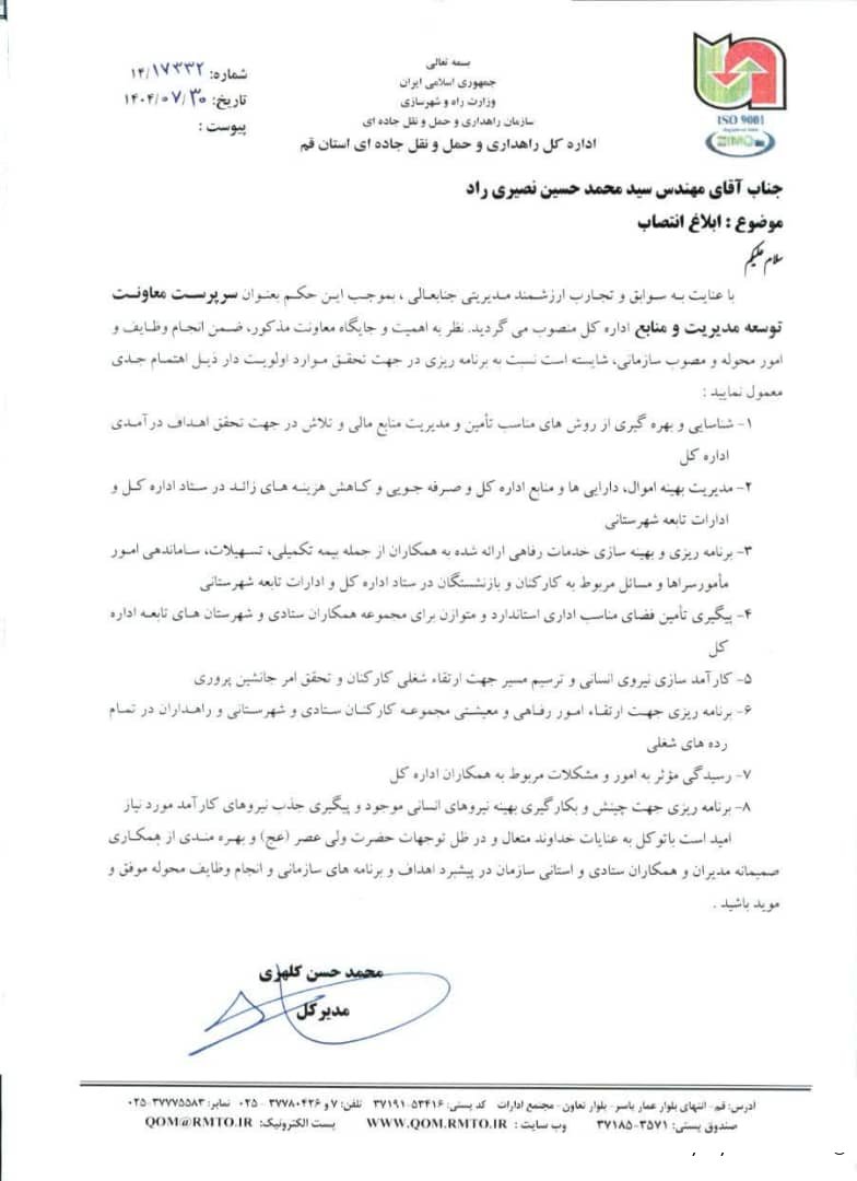 طی حکمی از سوی محمد حسن کلهری ،معاون توسعه و مدیریت و منابع اداره کل راهداری و حملونقل جادهای استان قم شد.