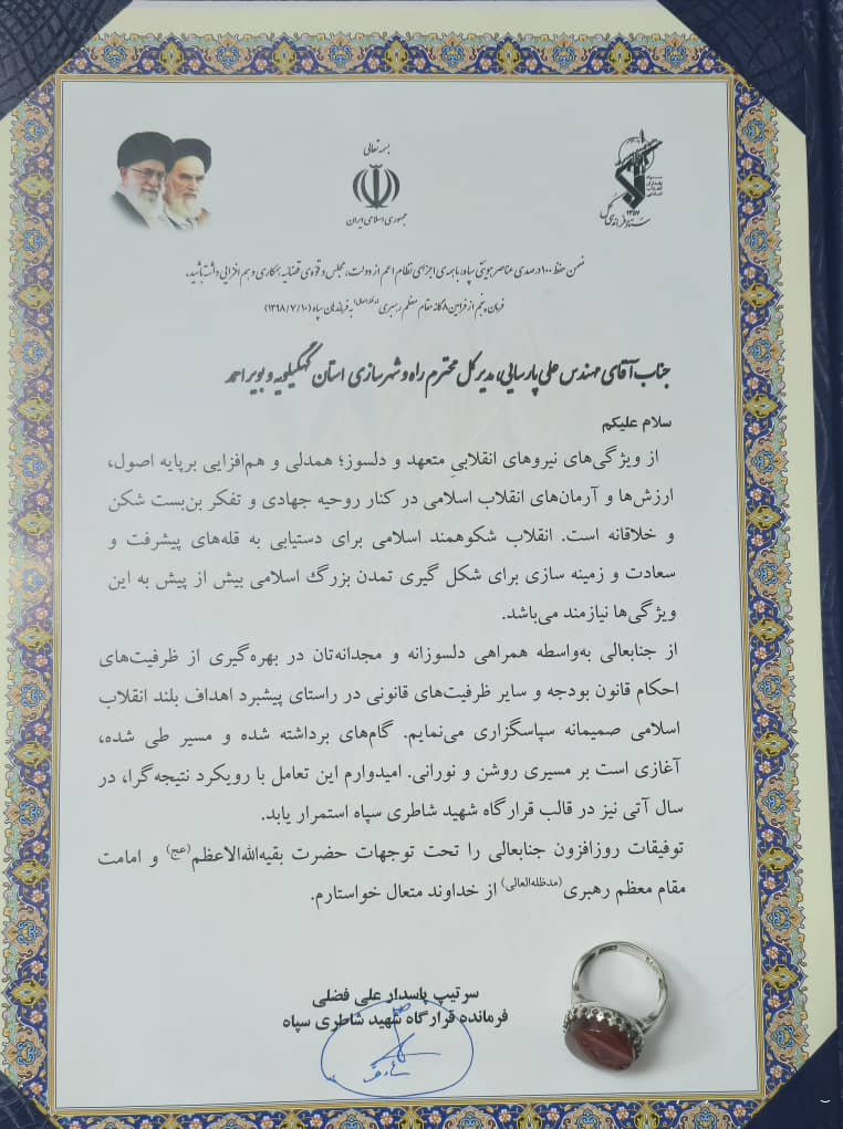 از جنابعالی به واسطه همراهی دلسوزانه و بهرهگیری مؤثر از ظرفیتهای احکام قانونی بودجه و سایر ظرفیت های قانونی در راستای پیشبرد اهداف بلند انقلاب اسلامی صمیمانه سپاسگزاری مینمایم. امیدوارم این تعامل بارویکرد نتیجه گرا در سال آتی در قالب قرارگاه شهید شاطری سپاه در سال آینده نیز استمرار یابد.