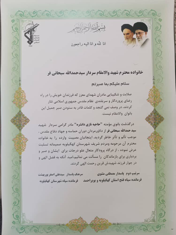 فرمانده سپاه فتح استان و فرمانده سپاه شهرستان کهگیلویه با صدور پیامی مشترک درگذشت مادر سردارشهید والامقام سید حمدالله سبحانی فر را تسلیت گفتند.
