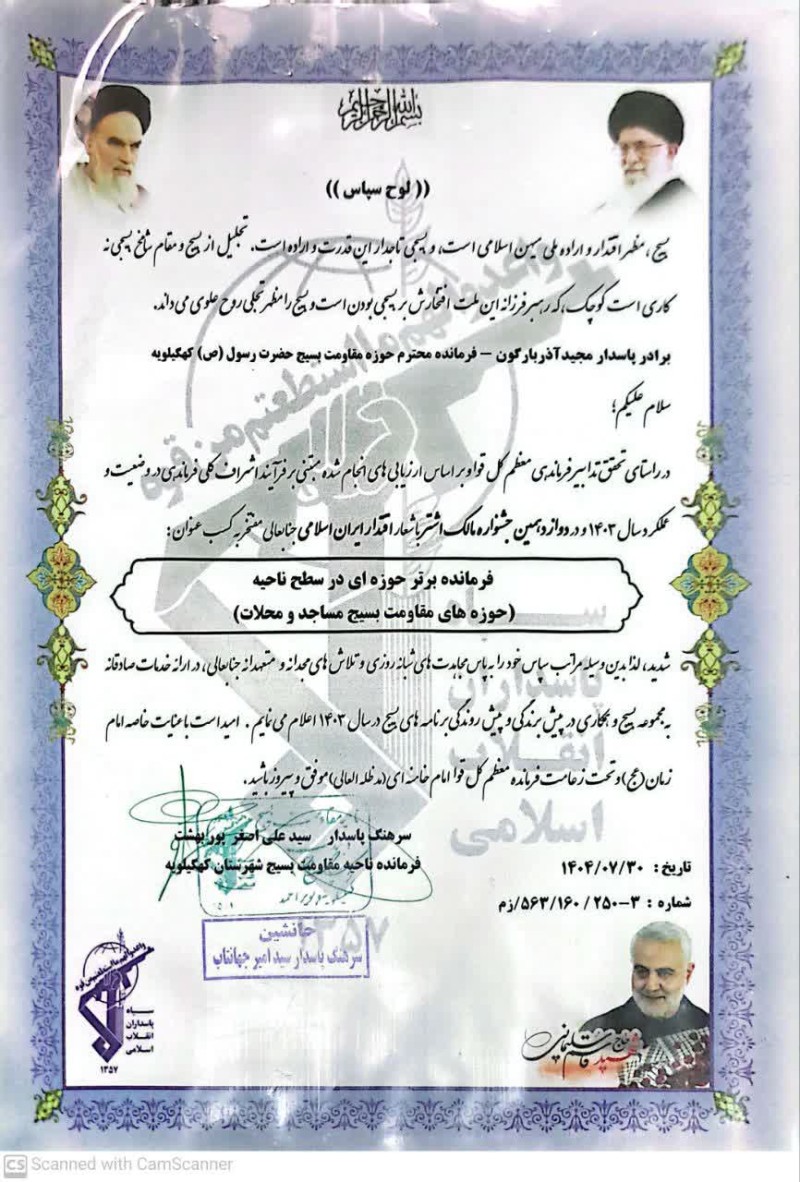 لازم به ذکر هست که سروان پاسدار مجید آذربارگون در چهار سال اخیر بهعنوان فرمانده حوزه مقاومت بسیج شهید بهشتی جاورده و فرمانده حوزه مقاومت بسیج حضرت رسول (ص) دهدشت فرمانده برتر شهرستانی و در سال ۱۴۰۲ نیز فرمانده حوزه برتر استانی انتخاب شده است.