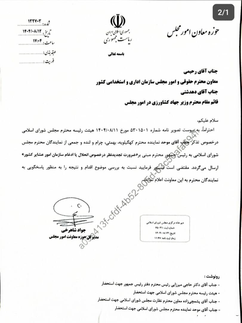 در پی تصمیم دولت برای ادغام سازمان امور عشایر کشور سید محمد موحد، نماینده مردم کهگیلویه، بهمئی، چرام و لنده به همراه ۳۴ نماینده دیگر مجلس شورای اسلامی در تذکری رسمی به رئیسجمهور و وزیر جهاد کشاورزی نسبت به پیامدهای این اقدام هشدار داده و خواستار بازنگری فوری و کارشناسی در این تصمیم شدند.