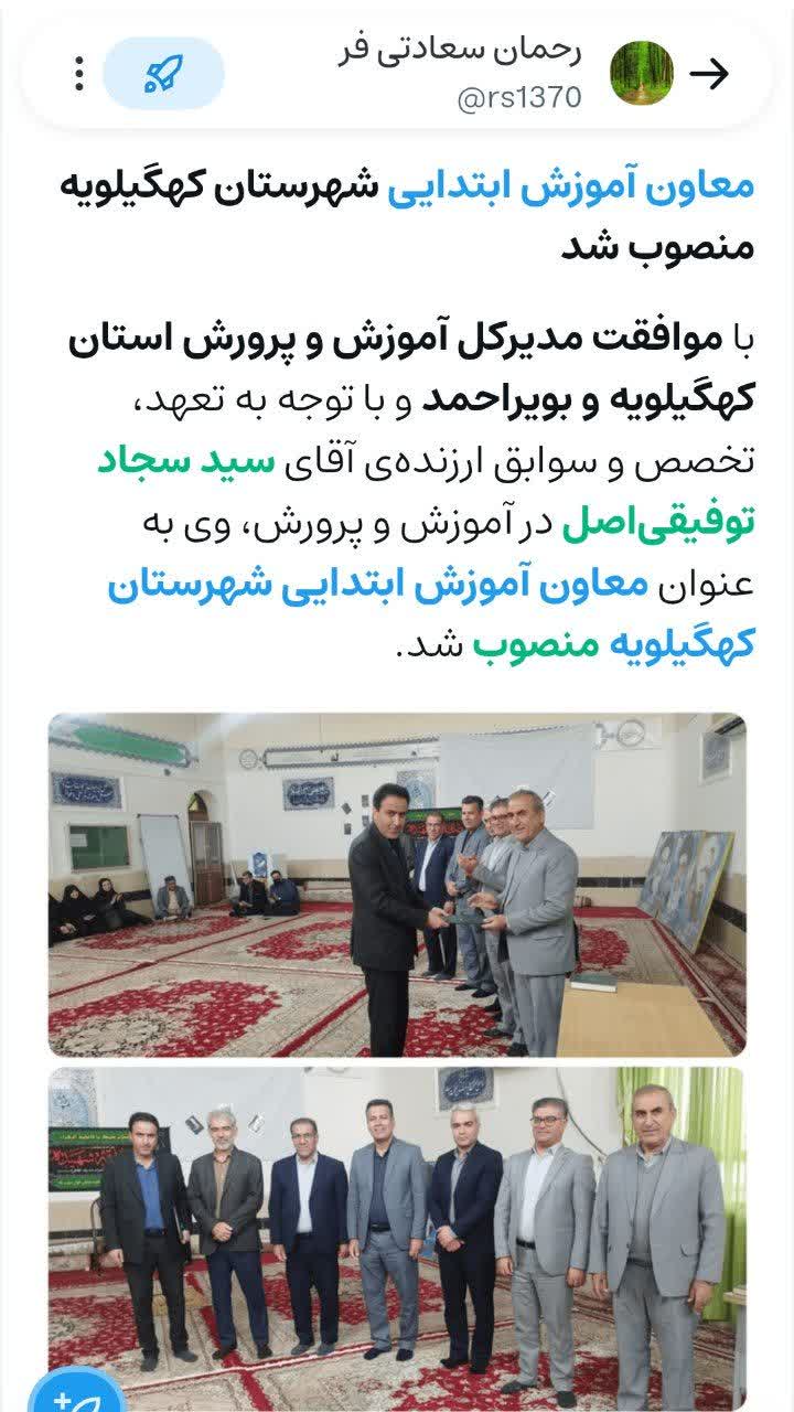 به گزارش راک نیوز،با موافقت مدیرکل آموزش و پرورش استان کهگیلویه و بویراحمد و با توجه به تعهد، تخصص و سوابق ارزندهی آقای سید سجاد توفیقیاصل در آموزش و پرورش، وی به عنوان معاون آموزش ابتدایی شهرستان کهگیلویه منصوب شد.
