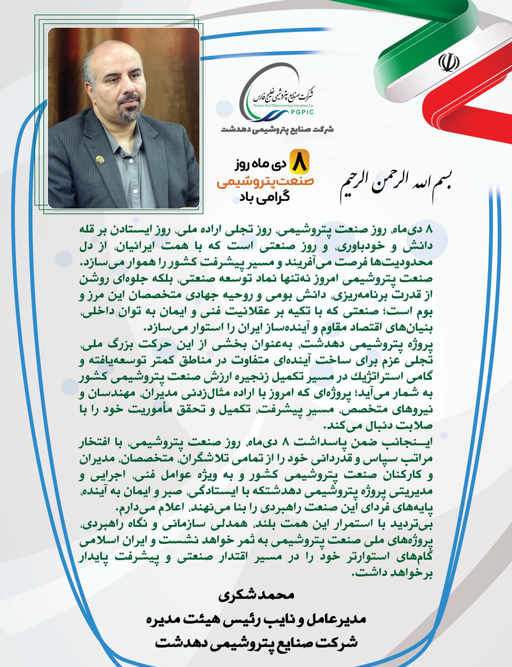 » پیام تبریک مهندس محمد شکری مدیرعامل و نایب رئیس هیئت مدیره شرکت صنایع پتروشیمی دهدشت به مناسبت ۸ دی ماه روز صنعت پتروشیمی