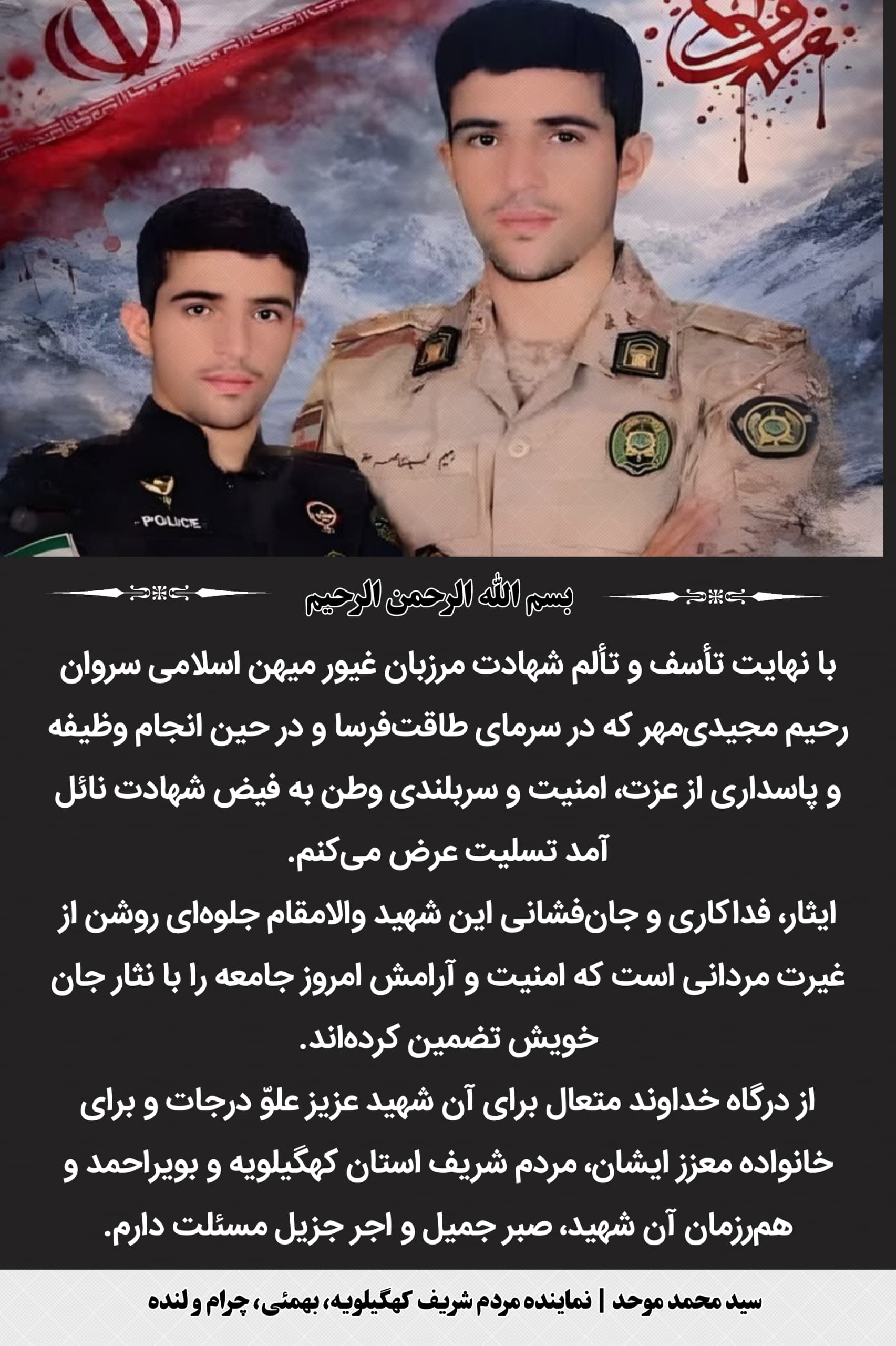 با نهایت تأسف و تألم، شهادت سروان رحیم مجیدی مهر مرزبان غیرتمند میهن اسلامی که در سرمای طاقت فرسا و هنگام ادای وظیفه در راه پاسداری از عزت و امنیت وطن به دیدار معبود شتافت را تسلیت عرض می‌کنم.