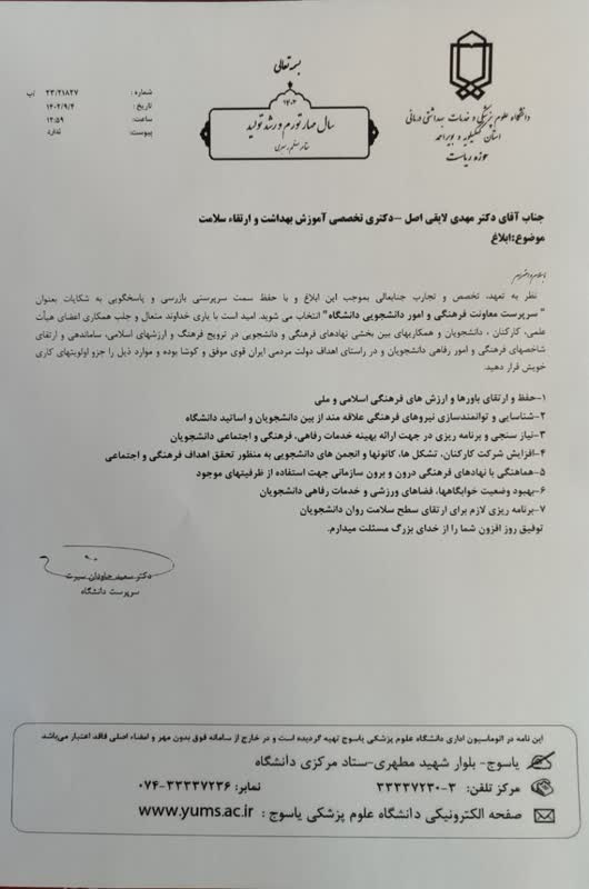 طی حکمی از طرف دکتر سعید جاودان سیرت؛ سرپرست دانشگاه علوم پزشکی یاسوج "دکتر مهدی لایقی اصل "به عنوان سرپرست معاونت فرهنگی و امور دانشجویی دانشگاه علوم پزشکی یاسوج منصوب واز خدمات دکتر روایی معاون پیشین تقدیر شد.