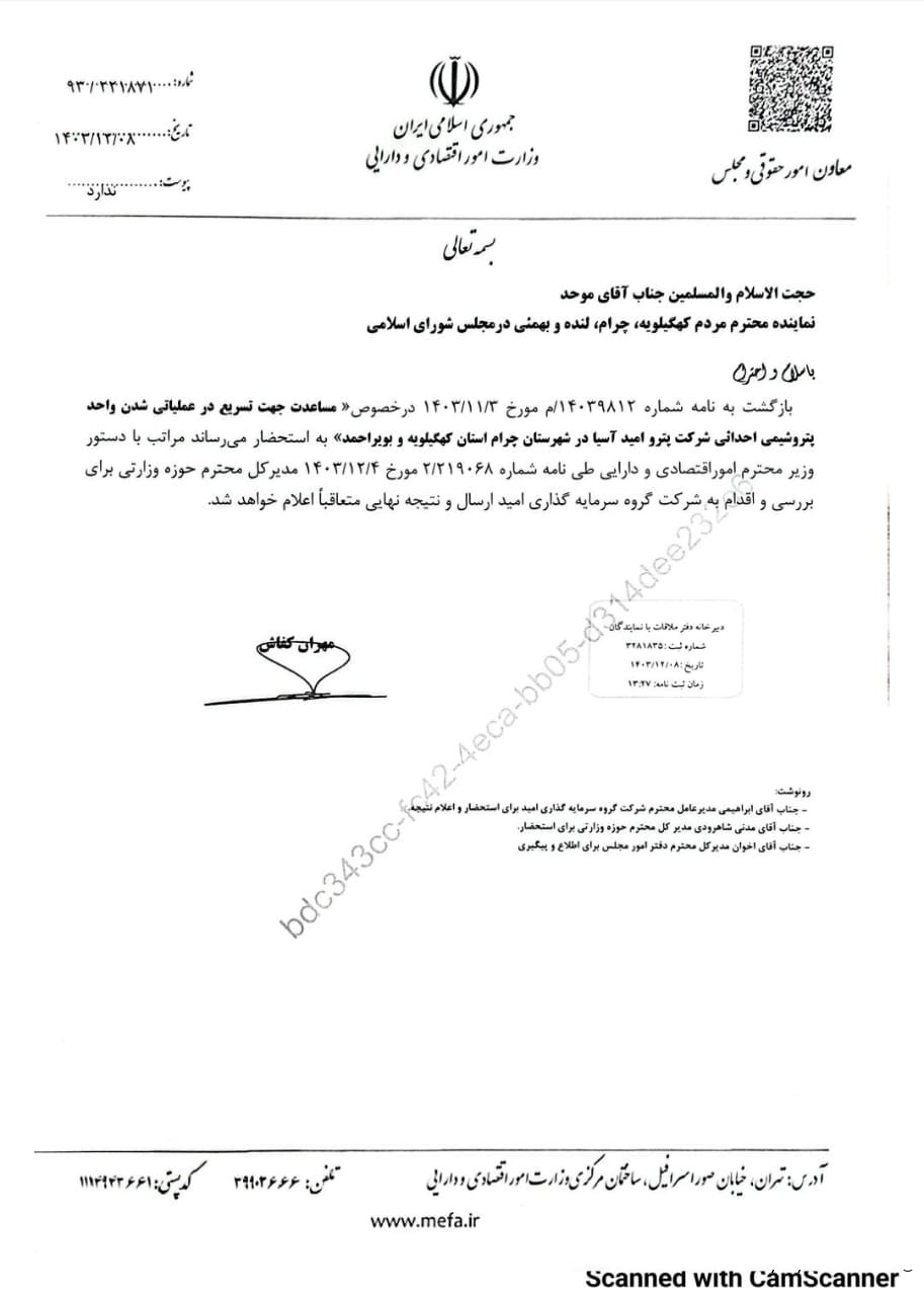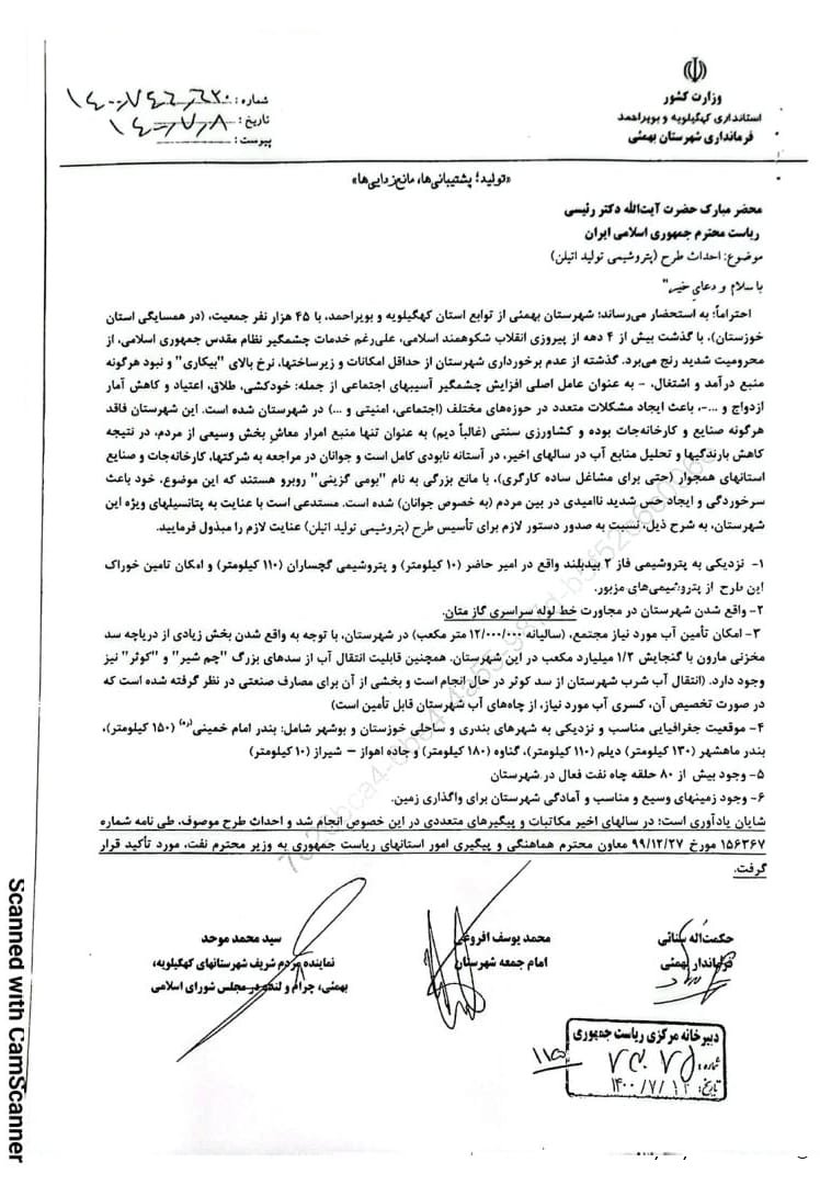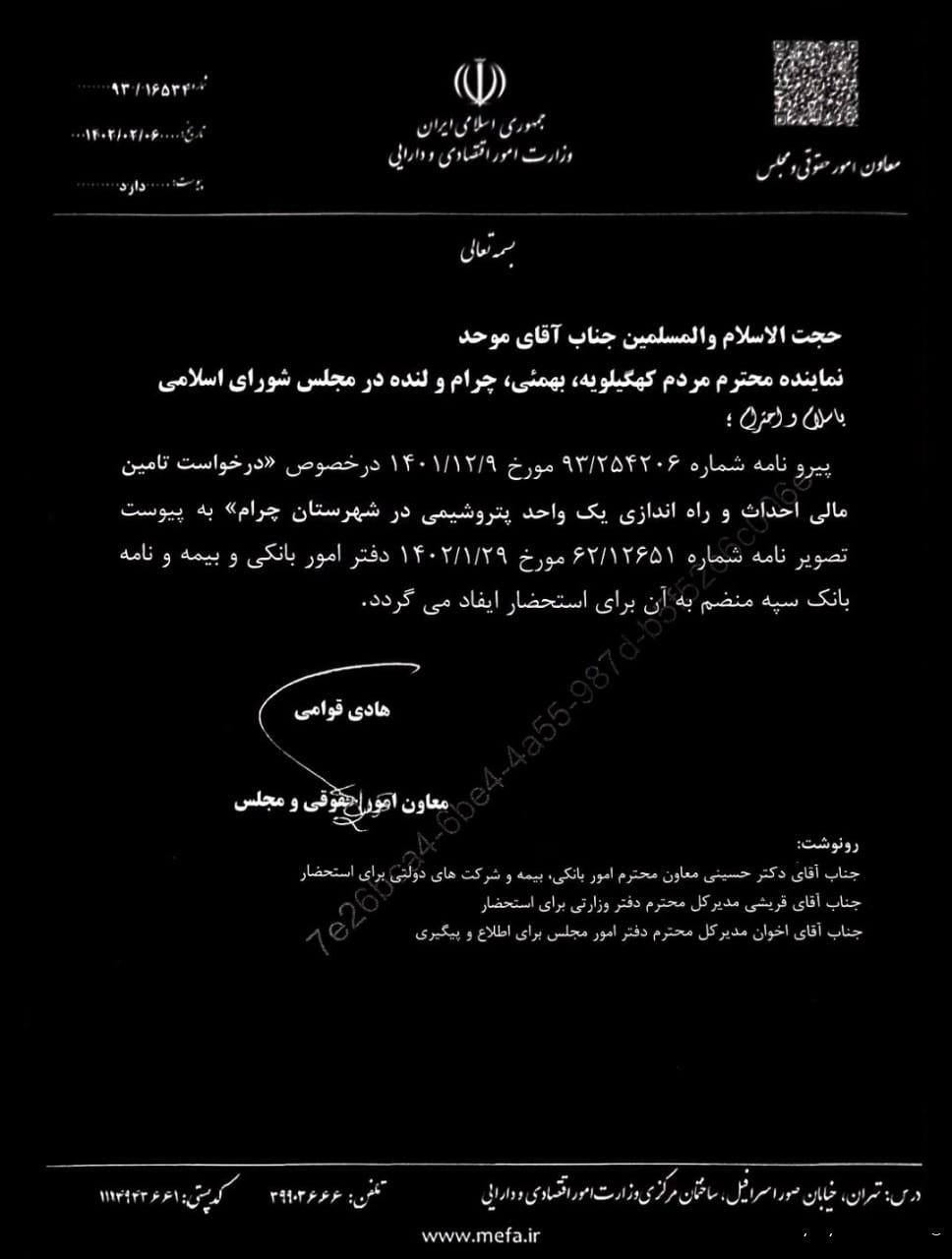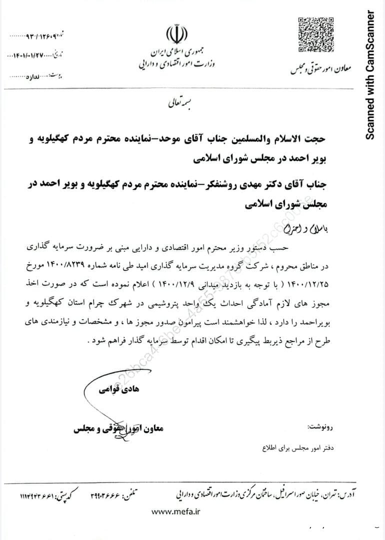 سید محمد موحد نماینده کهگیلویه بزرگ و یدالله رحمانی استاندار کهگیلویه و بویراحمد در دیدار ویژه ای با مسعود پزشکیان رئیس جمهور موفق شدند مصوبه نهائی احداث پتروشیمی چرام را اخذ نمایند .