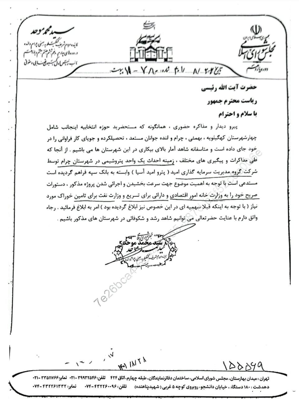 در این جلسه که با حضور دکتر مسعود پزشکیان رئیس جمهور برگزار گردید و سید کامل تقوی نژاد دبیر هیئت دولت، پاک نژاد وزیر نفت ، مدنی زاده وزیر اقتصاد ، پورمحمدی رئیس سازمان برنامه و بودجه ، بورد مدیرعامل شرکت ملی نفت ایران ، زراعتکار معاون برنامه ریزی وزیر نفت ، عباس زاده مدیرعامل شرکت ملی صنابع پتروشیمی ایران ، ابراهیمی مدیرعامل بانک سپه و مدیرعامل شرکت سرمایه گذاری بانک سپه نیز شرکت داشتند سید محمد موحد با ارائه گزارشی از روند پیگیری های مستمر برای احداث این واحد پتروشیمی در دولت گذشته و دولت کنونی و برگزاری نشستهای مختلف با مسئولین ارشد دولتی و سرمایه گذار مشخص ( بانک سپه و پتروامید آسیا ) و اخذ دستورات متعدد جهت تسریع در روند احداث پتروشیمی چرام از رئیس جمهور محترم خواست در این جلسه که با درایت شخص دکتر پزشکیان و همکاری و هماهنگی دکتر رحمانی استاندار کهگیلویه و بویراحمد و به سرعت تشکیل شده است با در نظر گرفتن شرایط ویژه منطقه و نرخ بالای بیکاری بصورت خاص دستور رفع موانع پیش رو و صدور مجوزات را صادر نماید . استاندار کهگیلویه و بویراحمد نیز در این جلسه با برشمردن ظرفیتهای شهرستانهای کهگیلویه بزرگ و نیاز ضروری جهت افزایش تولید ملی و اشتغالزائی عنوان نمود پتروشیمی چرام بعنوان یک مطالبه عمومی است که در سفر اخیر رئیس جمهور محترم به استان نیز هم توسط نماینده مردم و هم مجموعه استانداری مطرح گردید .
