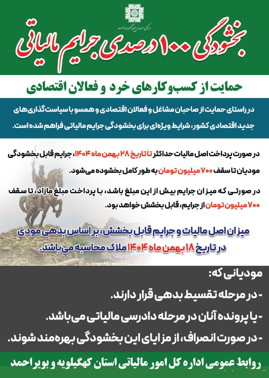مدیرکل امور مالیاتی کهگیلویه و بویراحمد جزئیات بخشودگی جرایم مالیاتی را که تا ۲۸بهمن ۱۴۰۴مهلت دارد را اعلام کرد.